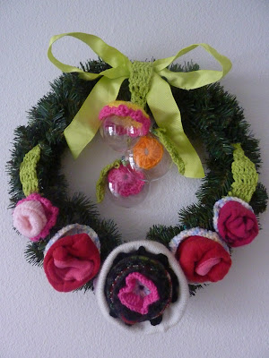Made 4 small crochet circles using pink and white yarn.Pull the mittens finger part little inside and fold them as it looks like a flower bulb and stitch them to the crochet circles. Similarly fold the leg warmer as a flower and put it on top of the hat and press it down to cover the leg warmer outside to look like a petal. Now arrange all these five flowers as shown in the picture to the wreath and tie them securely by passing yarn through these flowers.